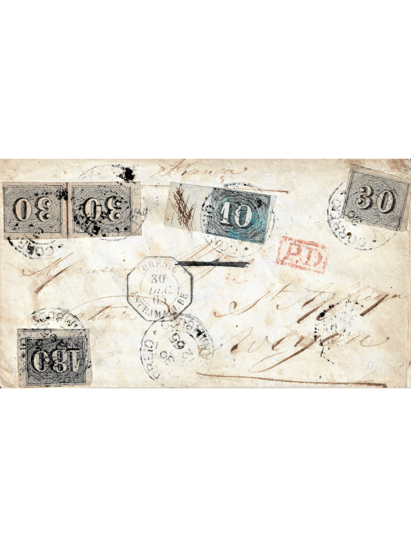 10 reis bleu bord de feuille, 30 reis gris en paire plus une unité et 180 reis gris foncé, oblitérés par le cachet à date du Correio (courrier) de Pernambuco le 30 décembre 1865, sur une enveloppe à destination de la France. Au recto, le cachet Français exagonal, Brésil Estramadure et PD en rouge. Au verso, les cachets d'arrivée en France. Exceptionnelle et rare affranchissement. Signée CALVES. Certificat.