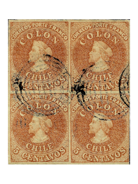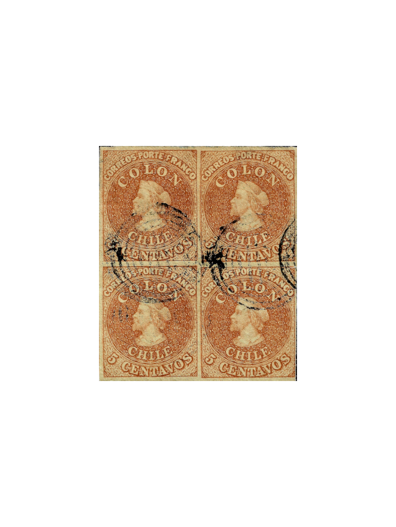 5 centavos impression de 1854, très rare et très belle nuance cannelle, bloc de 4, oblitéré par le cachet de cercles. Superbe qualité, effigies bien dégagées avec 4 belles marges et une belle fraicheur. Très rare en bloc de 4. Signé avec certificat.