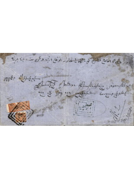 Lettre avec correspondance, envoyée sans timbre au départ de KUTAHYA81 cachet rectangulaire bleu au recto à destination d' Istanbul. A l'arrivée, le postier a apposé un 1/2 timbre et 1/4 de timbre de deux piastres pour la tarif à 1 piastre et demi. Au verso, le cachet d'arrivée à Istanbul. Exceptionnelle combinaison. Certificat GUY du VACHAT.
