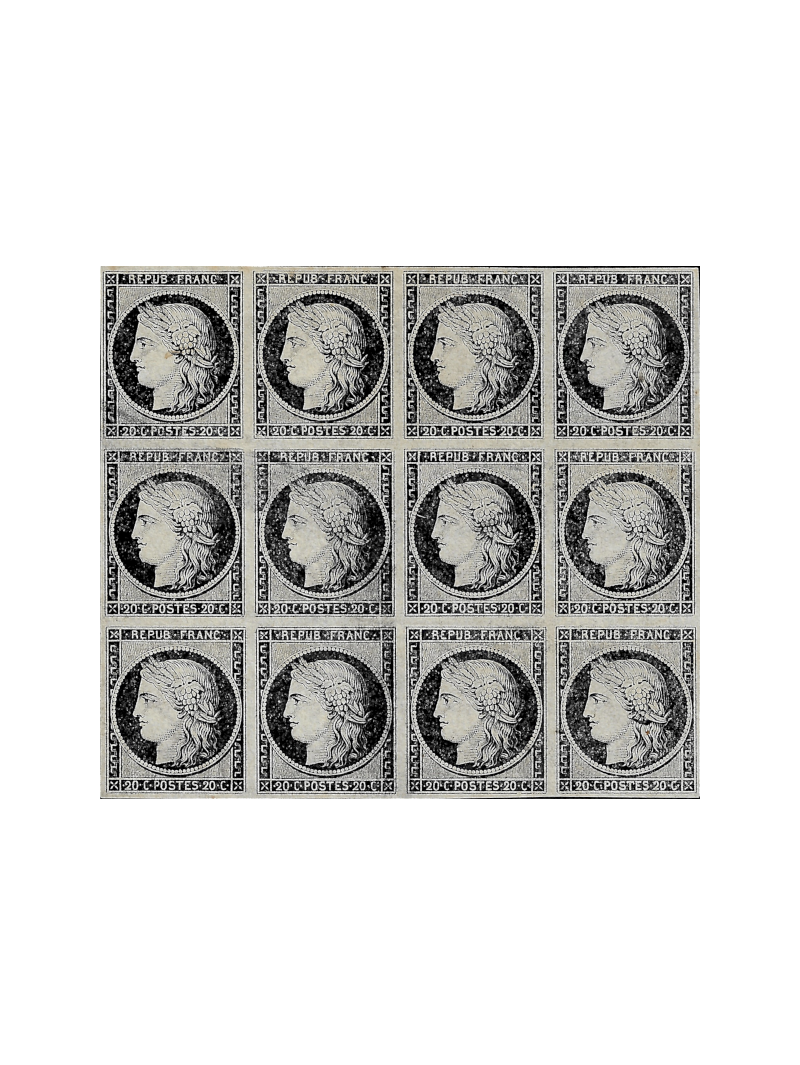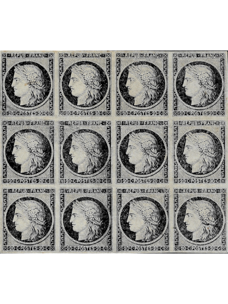 20 centimes noir sur blanc, bloc de 12 neuf sans gomme de très belle qualité. Rare dans cet état. Exceptionnel bloc d'essai. Certificat.