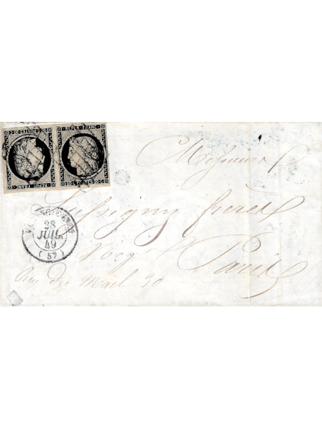 20 centimes noir intense sur jaune (proche du chamois), en paire tête-bêche de très belle qualité, avec quatre belles marges dont trois énormes, sur lettre avec correspondance en double port à destination de Paris. Au recto, le cad type 15, Valenciennes le 28 juillet 1849. Exceptionnelle. Signée Octave Roumet avec certificat.