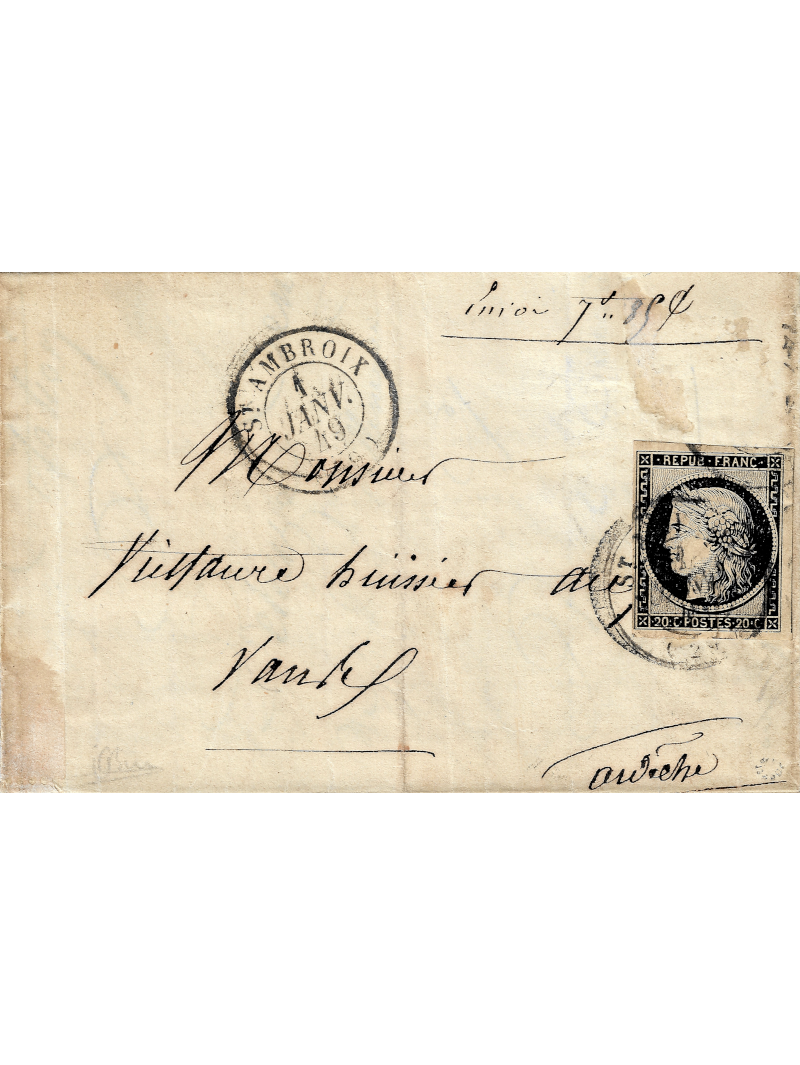 20 centimes noir sur blanc de très belle qualité (présence du voisin de droite) oblitéré par le cachet à date de type 15 de Saint Ambroix le 1er janvier 1849, répété au recto, sur lettre avec correspondance à destination de l'Ardèche. Au verso, le cachet d'arrivée le 2 janvier. Lettre prévue en double port, à la suite de l'ajout d'un document décrit dans la correspondance, qui a été retiré ainsi que le deuxième timbre. Exceptionnelle. Signée JF BRUN et Roumet avec certificat.