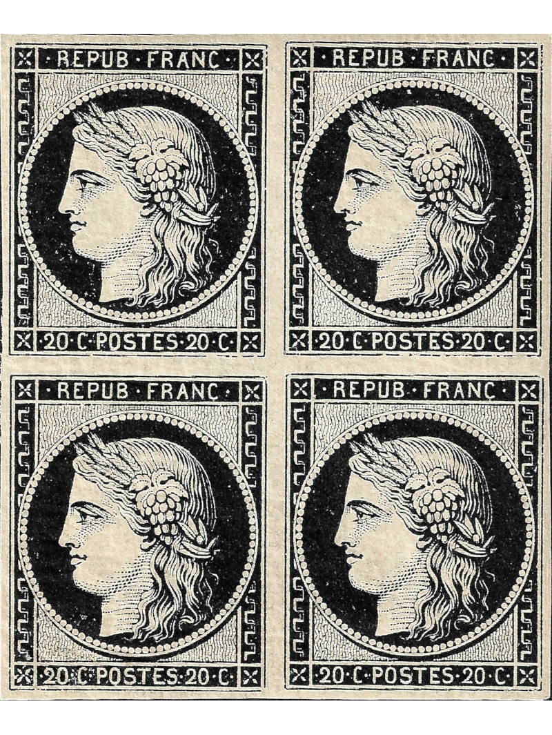 20 centimes noir intense sur blanc, bloc de 4 neuf avec gomme sans charnière de très belle qualité, avec quatre belles marges. Superbe. Signé Calves. Certificat.