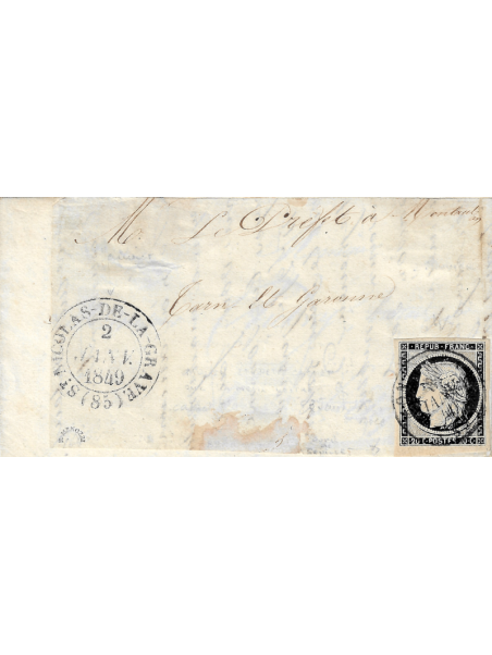 20 centimes noir sur blanc avec de des belles marges, oblitéré à l'arrivée par le cachet à date de type 15 du Tarn le 3 janvier 1849 ( non oblitéré au départ). Au recto, le cachet à date de type 13 de Saint Nicolas de la Grave sur devant de lettre (bureau de 6ème classe). Superbe et très rare. Signée Menozzi.
