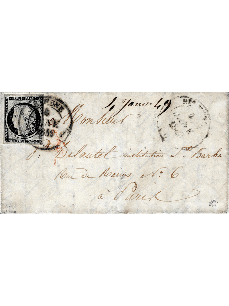 20 centimes noir sur blanc de très belle qualité, oblitéré par le cad type 14 de Beaune le 4 janvier 1849, superbe frappe, répété au recto, sur lettre avec correspondance pour Paris. Au verso, le cachet d'arrivée à Paris. Lettre exceptionnelle. EX Masterpiece of french Philately - Cote Yvert et Tellier : 15000 €. Signé JF Brun et Roumet avec certificat.
