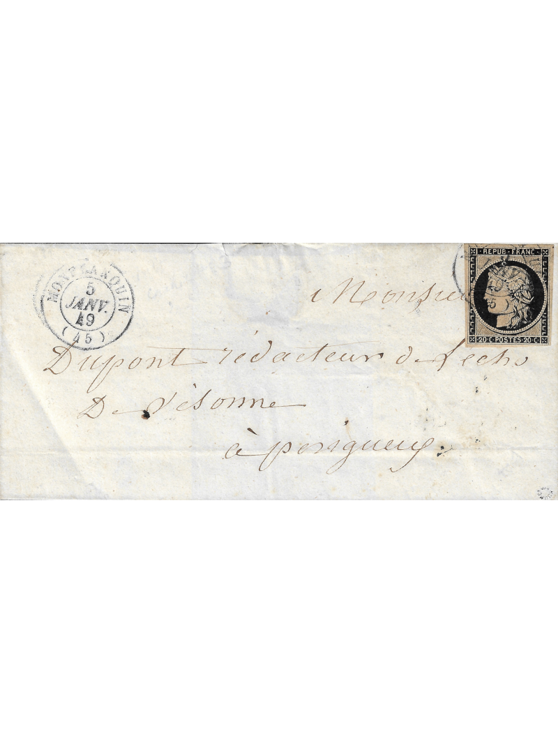 20 centimes noir sur chamois, quatre belles marges et nuance exceptionnelle, oblitéré par le T15 de Monflanquin le 5 janvier 1849( 2 lettre connues dans ce bureau en janvier 49) sur une lettre avec correspondance pour Périgueux. Au verso, le cad type 13 d'arrivée. Exceptionnelle, signée Roumet. Certificat.
