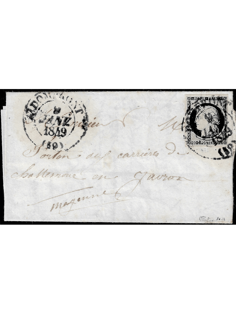 20 centimes noir intense sur blanc de qualité remarquable, annulé par le grand cachet à date type 13 de Domfront (59) le 9 janvier 1849 sur une lettre avec correspondance à destination de la Mayenne. Au recto, répété le cad de Domfront, deux superbes frappes et au verso le cad d'arrivée. Pièce d'amateur et d'exposition. Une des deux lettres référencées. Exceptionnelle, signée Calves. Certificat.