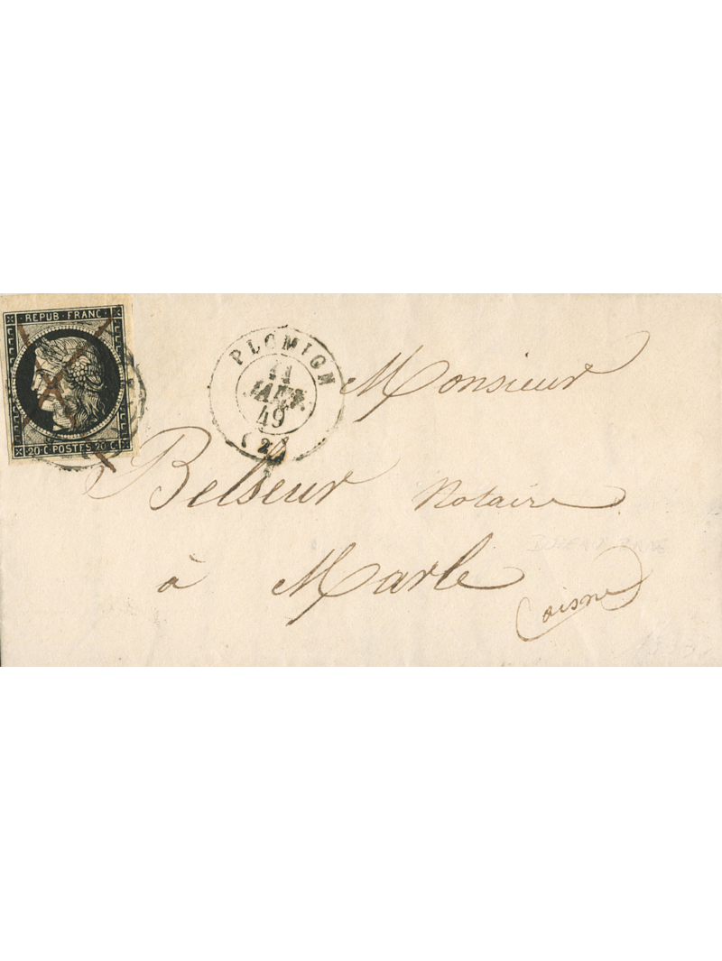 20 centimes noir, superbe nuance noir intense sur jaune, de superbe qualité avec quatre grandes marges dont haut de feuille et voisin, oblitéré par le cachet à date de Plomion le 11 janvier 1849 et par la plume sur une lettre avec correspondance pour Marthe. Deux lettre connues en janvier dans ce très rare bureau. Certificat.