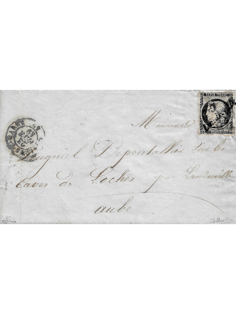 20 centimes noir intense sur jaune, de belle qualité, oblitéré par la cursive, 9 Landreville sur lettre avec correspondance de Chalon sur Marne à destination de Landreville. La grille frappée au départ est invisible, à l'arrivée à destination, le postier a donc annulé le timbre avec sa cursive. Cote Yvert et Tellier : 35 000 €. Ex. Masterpieces of french Philately. Très rare. Signée Brun, Calves et Scheller avec certificat.