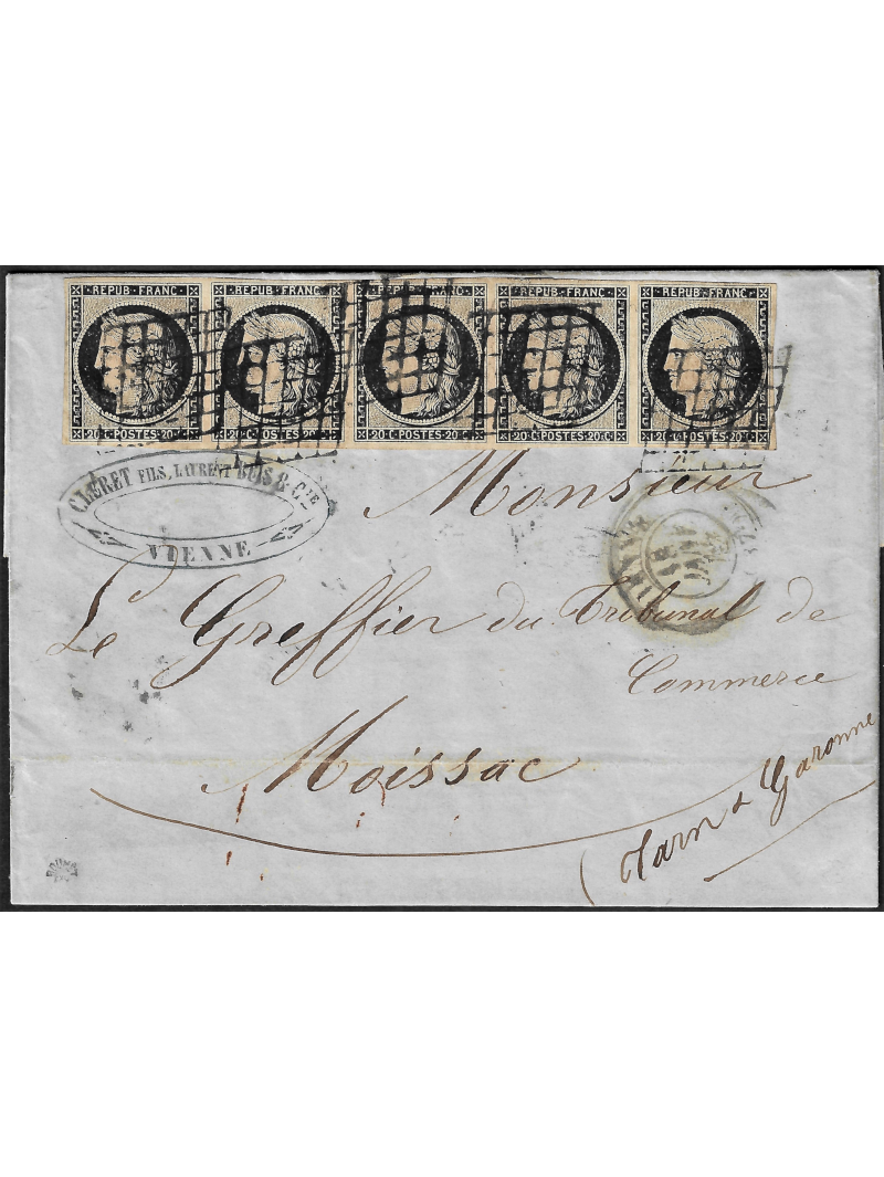 20 centimes noir intense sur jaune, bande de 5 avec de très belles marges oblitérées par la grille sur lettre (6 connues en janvier 49) avec correspondance en triple port de Viennes à destination de Moissac. Au recto, le cachet à date de Vienne le 18 janvier 1849. Exceptionnelle lettre et composition de janvier 1849. Signée Roumet. Certificat.