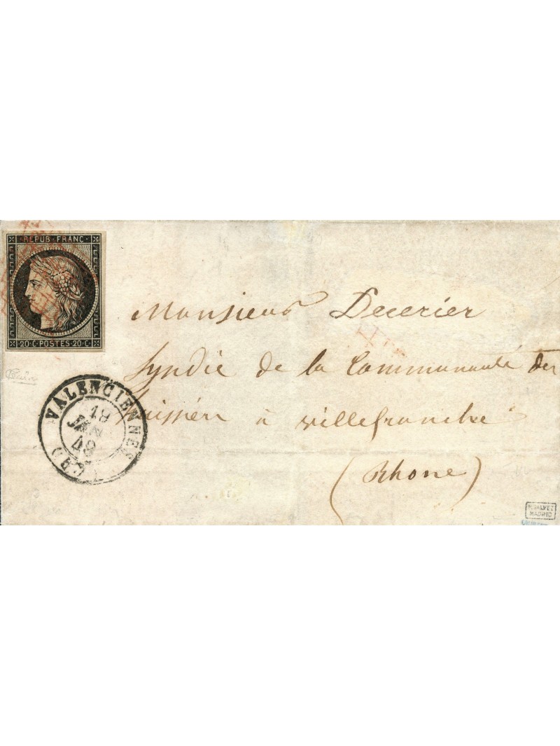 20 centimes noir avec quatre très belles marges, oblitéré par la grille rouge, deux belles frappes d'une superbe couleur foncée sur, une lettre à destination de Villefranche. Au recto, le cachet à date de Valenciennes le 19 janvier 1849. Très rare oblitération. Cote : 20 000 €. Plusieurs signatures dont Calves. Lettre de qualité exceptionnelle. Certificat BOULE.