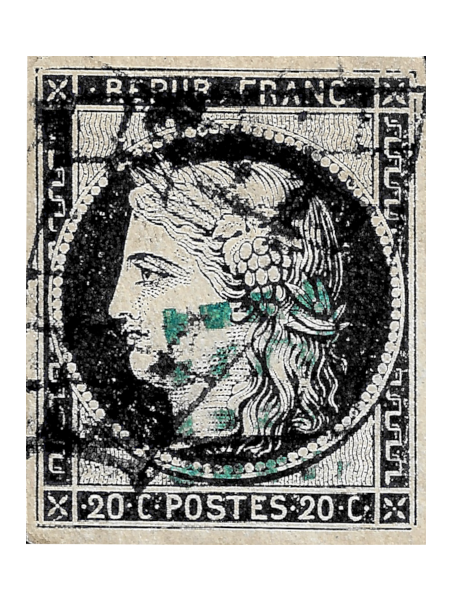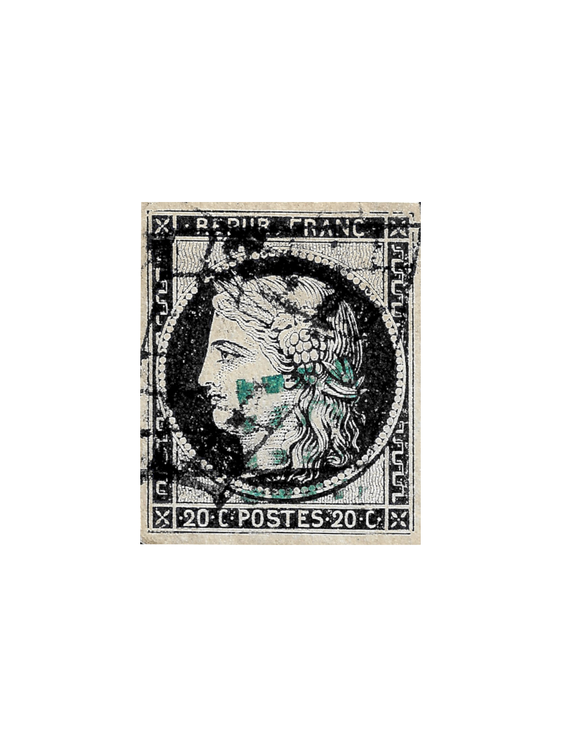 20 centimes noir sur blanc, de très belle qualité, oblitéré en première intention par un rouleau de très belle couleur bleue, puis ré oblitéré par dessus par la grille (deux frappes). Exceptionnelle oblitération. Certificat.