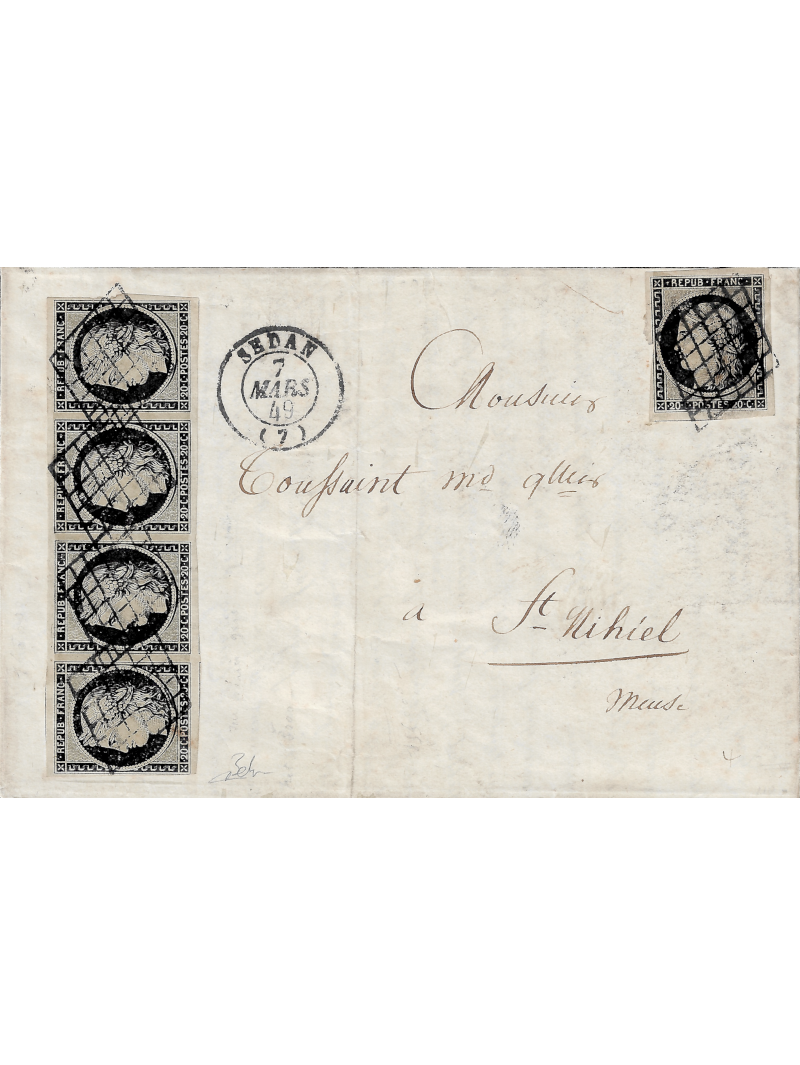 20 centimes noir sur blanc, bande de 4 avec de très belles marges dont voisins, oblitérée par la grille + un ex. avec défaut, sur lettre avec correspondance en triple port de Sedan à destination de Saint Mihiel dans la Meuse. Au recto, le cachet à date de Sedan le 7 mars 1849. Magnifique, signée Behr. Certificat.