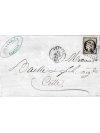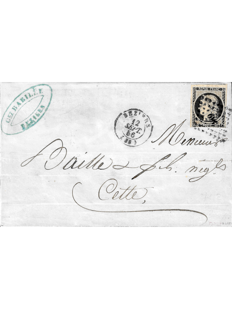20 centimes noir jaune, avec 3 grandes marges dont le voisin du haut, la marge basse, filet absent, oblitérée par le losange petits chiffres 389 sur lettre (correspondance refaite) de Béziers à destination de Cette. Au recto, le cachet à date de type 15 du 12 septembre 1856, très belle frappe et au verso, le cachet d'arrivée du lendemain. Cote Maury 2009 : 7000€. Qualité B mais très belle présentation, rarissime. Signée certificat Robineau.