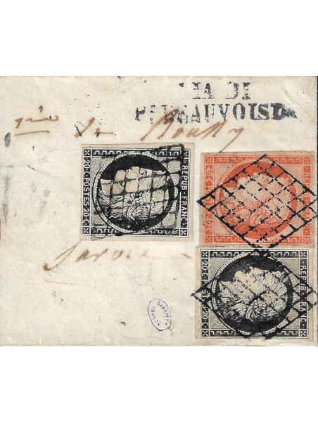 20 centimes noir sur jaune, deux unités, et 40 centimes orange, tous les trois avec de très belles marges, oblitérés par la grille sur une moitié d'enveloppe envoyée au tarif de 80 centimes à destination de . Au recto, la marque linéaire VIA DI PT Beauvoisin. Exceptionnelle composition. Signée avec certificat.