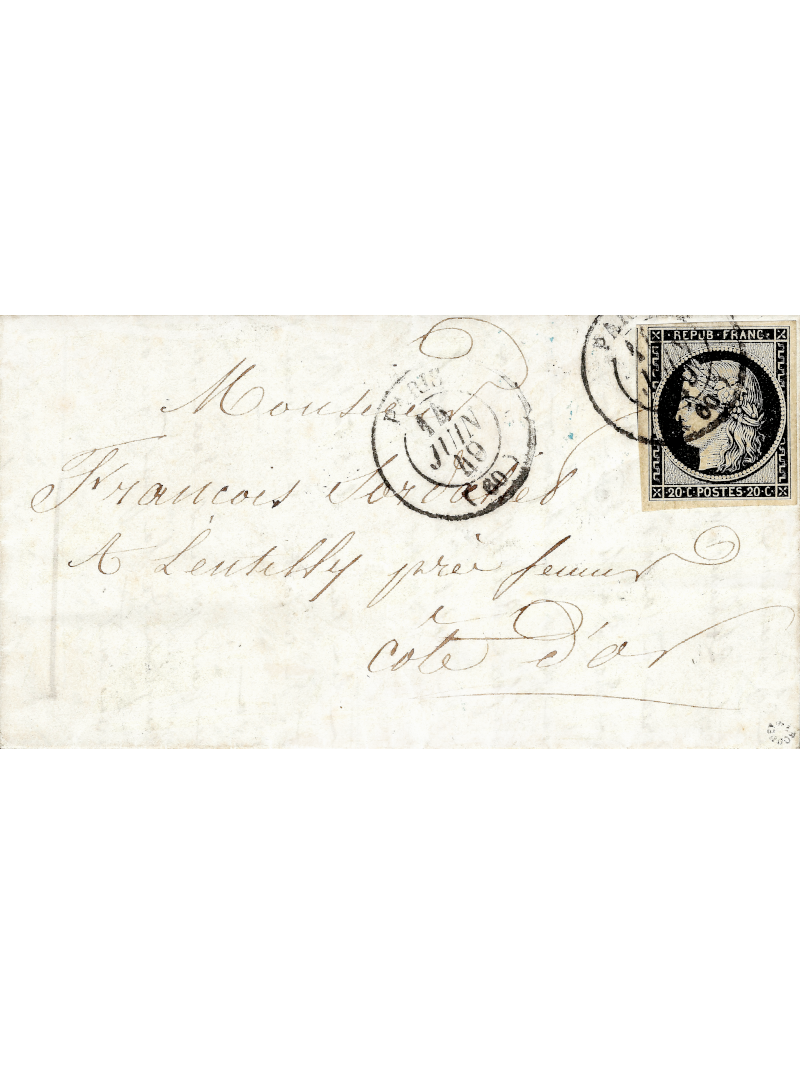 20 centimes noir sur blanc de qualité exceptionnelle, quatre grandes marges dont voisins de gauche, oblitéré par le cachet à date type 15 de Paris le 14 juin 1849, sur une lettre avec correspondance à destination de la Côte D'Or. Superbe. Signé Roumet avec certificat.
