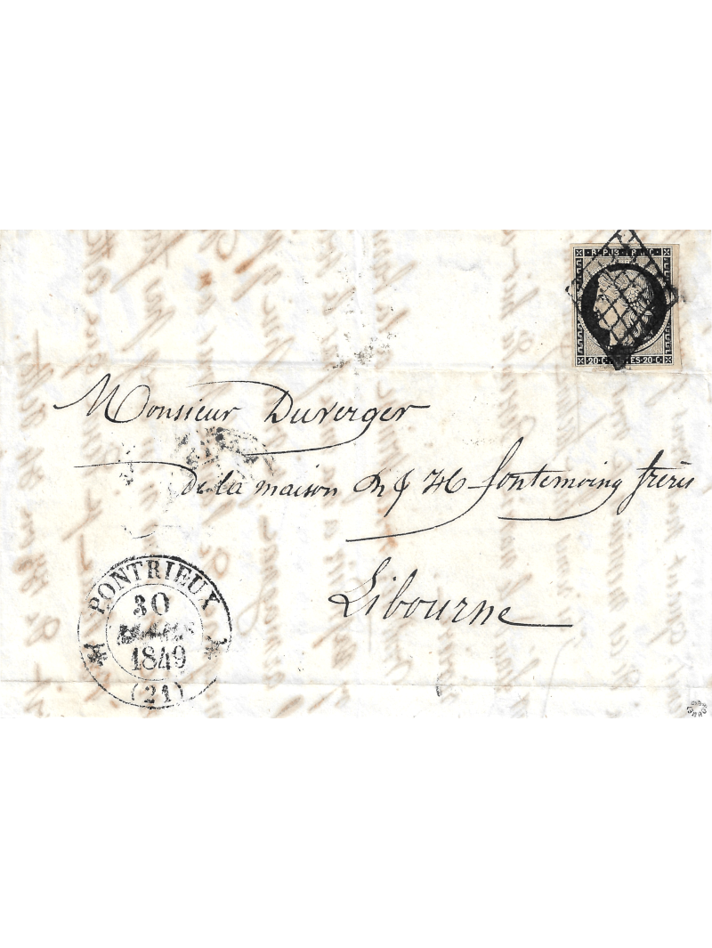 20 centimes noir sur jaune, de belle qualité oblitéré par la grille, sur grande lettre avec correspondance à destination de Libourne. Au recto, le grand cachet à date simple fleuron de Pontrieux le 30 mars 1849. Superbe frappe. Lettre superbe ex. "Grande Médaille d'OR PhilexFrance 1999". Très belle et rare composition.