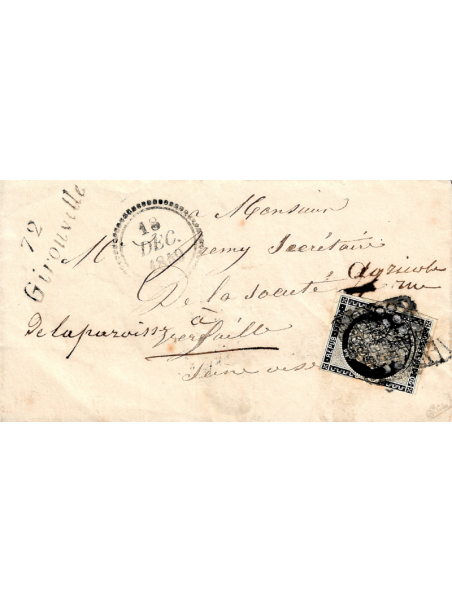 20 centimes noir de très belle qualité, quatre belles marges bien équilibrées, oblitéré par une grille alvéolaire, similaire à la grille de Châteauroux (alvéoles circulaires bien visibles -grille grasse) plusieurs frappes. Au recto, le dateur B du 13 décembre 1849 et la cursive 72 Gironville. Probablement unique. Signée Calves.