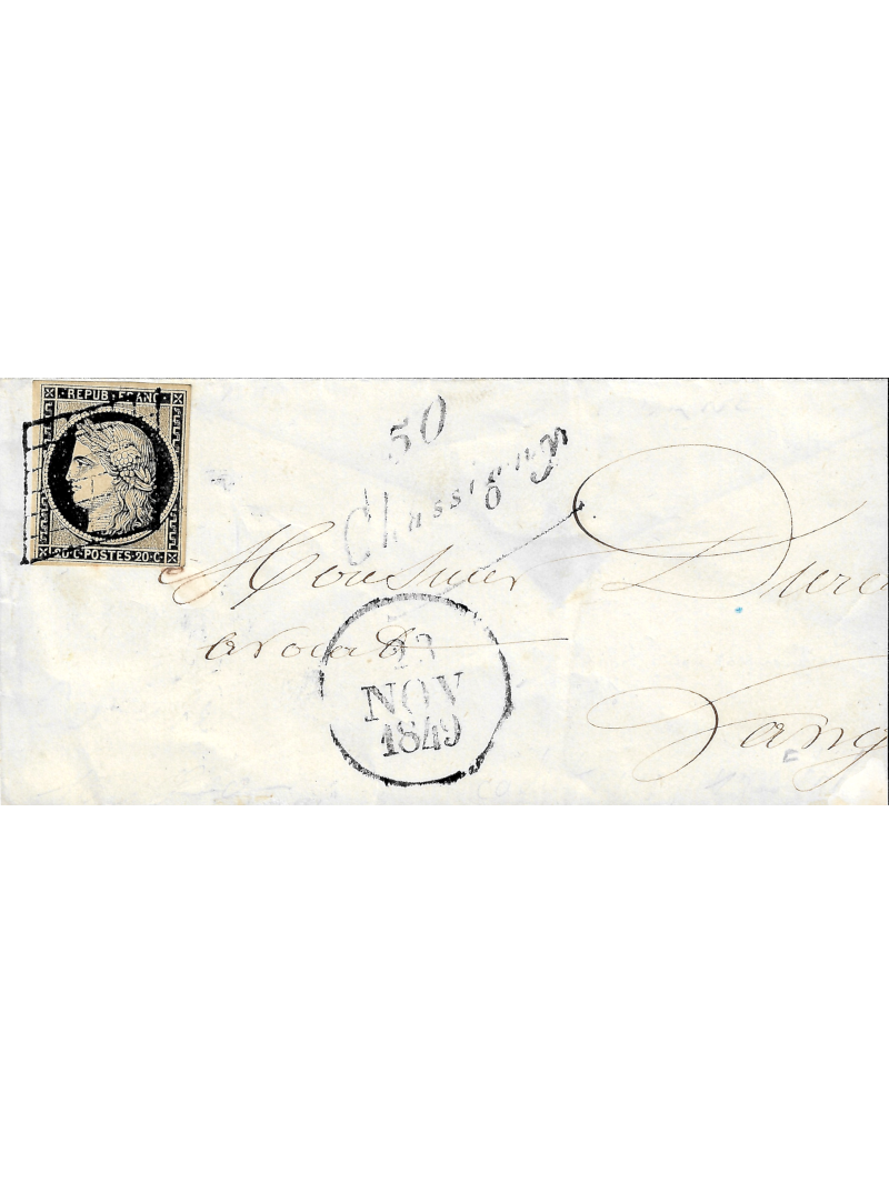 20 centimes noir sur jaune de très belle qualité, avec quatre très belles marges, oblitéré par la grille, sur une petite enveloppe à destination de Dangnes. Au recto, le dateur A du 23 novembre 1849 et la cursive 50 Chassigny. Au verso, le cad d'arrivée. Cote Maury 2009 : 2500 €. Très belle et rare composition.