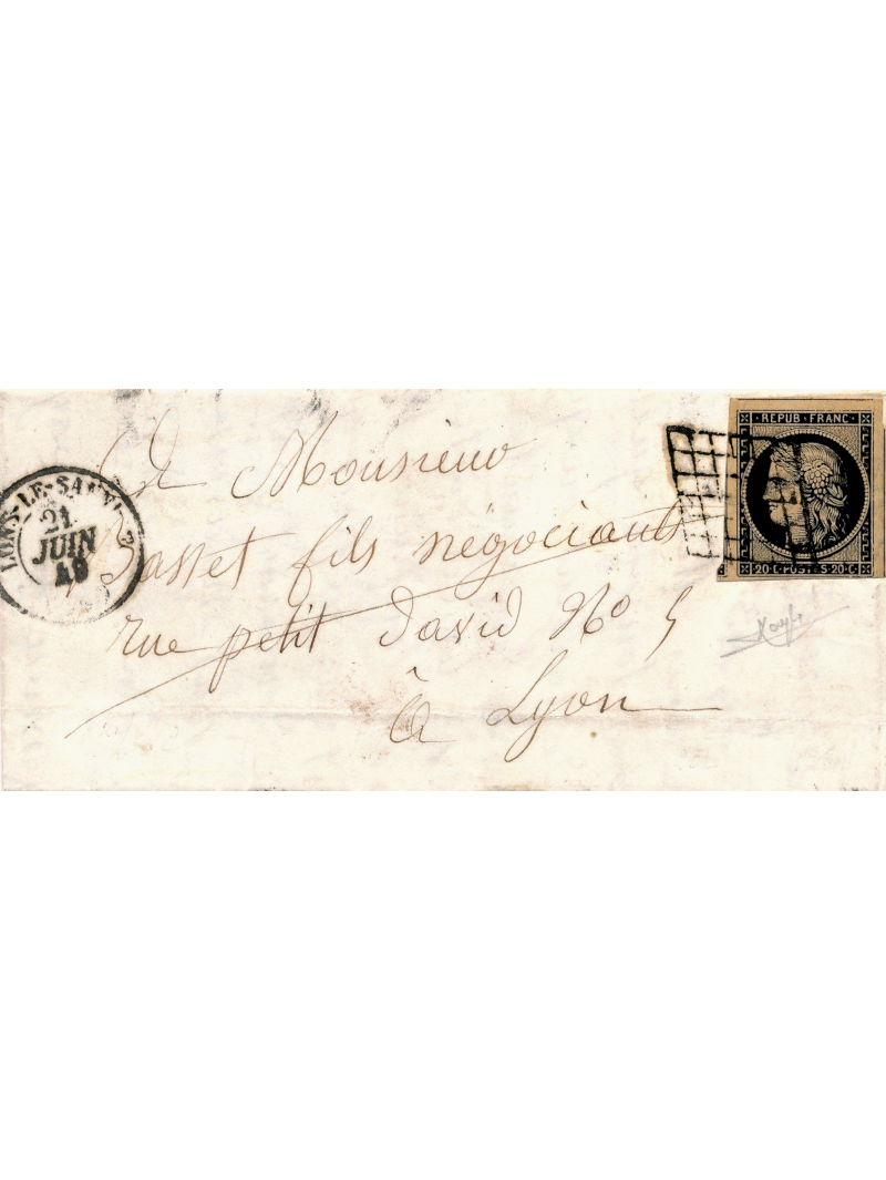 20 centimes noir de très belle qualité et une superbe nuance chamois, avec 4 belles marges, dont 3 géantes bien équilibrées, présence de 3 voisins, oblitéré par la grille sur une lettre avec correspondance à destination de Lyon. Au recto, le cachet à date de type 15 de Lons le Sauniers le 21 juin 49. Superbe. Signée avec certificat.