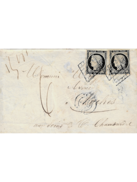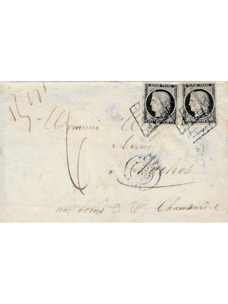 20 centimes noir jaune, deux unités de très belle qualité et de très belle nuance noir intense sur teinté, oblitérés par la grille sur une enveloppe envoyée en première intention en double port puis taxée 6 décimes, pour le triple port au tarif à 1 franc, poids indiqué au crayon. Au recto, le cachet à date de type 15 de Tours le 23 mars 1850. Très belle et très rare composition. Certificat.